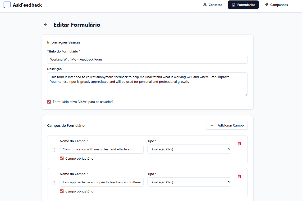 Aplicação web que facilita a cultura de feedback nas equipes. Permite que colaboradores solicitem e recebam feedbacks de forma estruturada, podendo escolher entre feedback anônimo ou identificado.